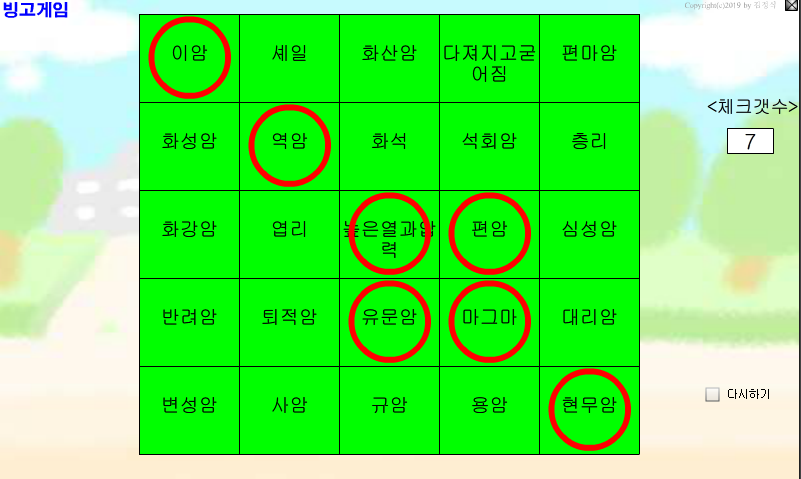 중간에 실수로 끝내는 걸 방지하기 위해서 다시하기에 체크를 해야 끝내기 버튼이 나타나고, 끝내기 버튼을 누르면 다시 빙고게임을 할 수 있다.
