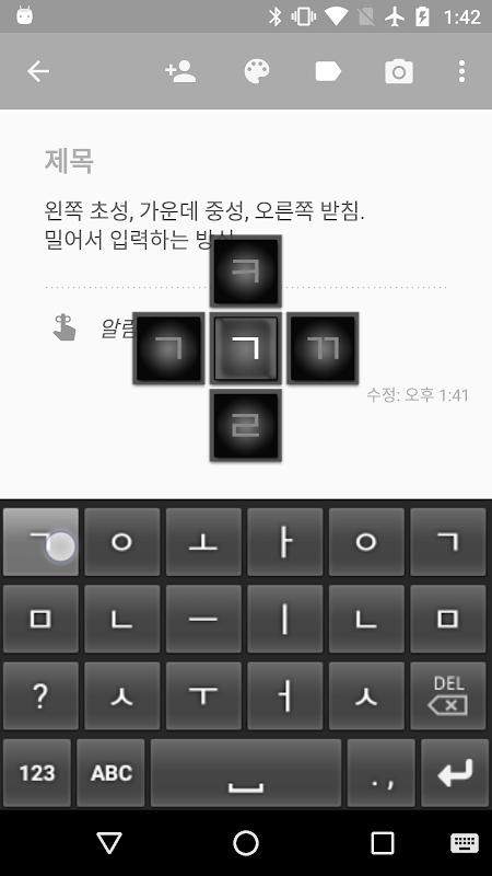 ㄴ 위로 밀기: ㅍ, 아래로: ㄷ, 오른쪽으로: ㄸ, 왼쪽으로: ㄹ