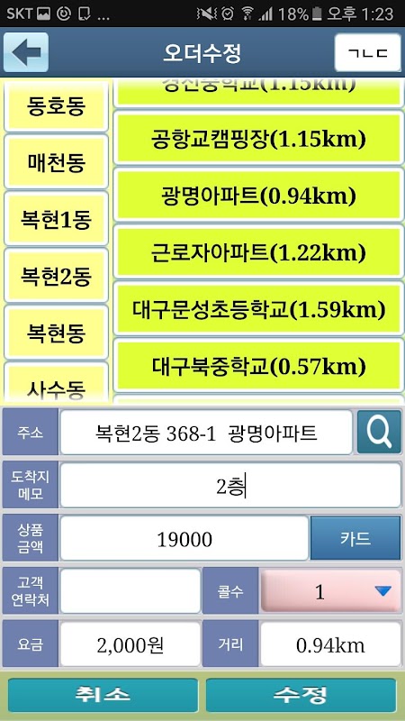 앱을 통하여 주문을 받은 배달대행 기사가 주문의 정보와 함께