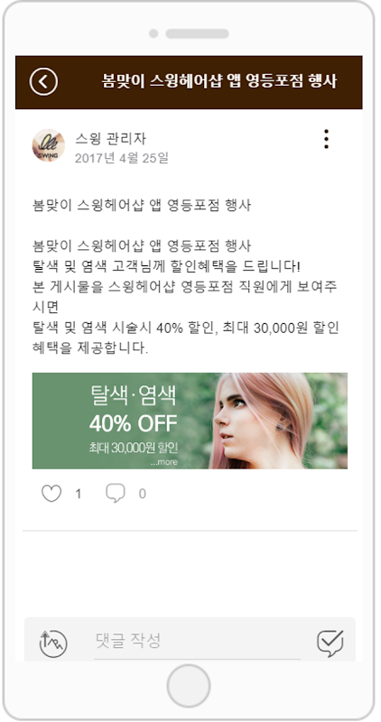 스윙투앱으로 제작된 헤어샵 업종 샘플앱입니다.