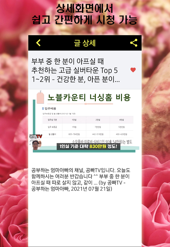 실버타운, 요양원 등 정보와 건강한 삶을 위한 영상 컨텐츠가 3000여개 수록되어있습니다.