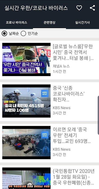 코로나 바이러스 , 중국 우한 발병한 바이러스에 관련된 기사와 유튜브의 내용을 실시간으로 제공하는