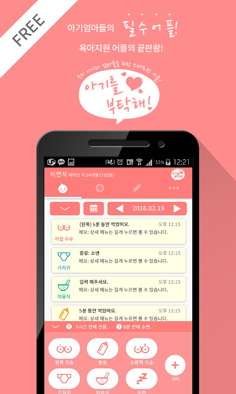 아기의 수유/수면 감지(CCTV 영상,진동,소리)/예방접종/위젯/통계/생활패턴 확립을 위한 육아 지원어플의 끝판왕!! 아기를 부탁해~