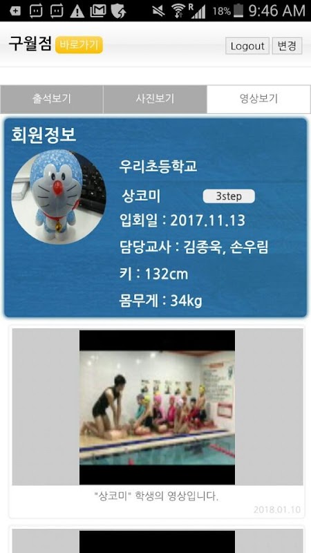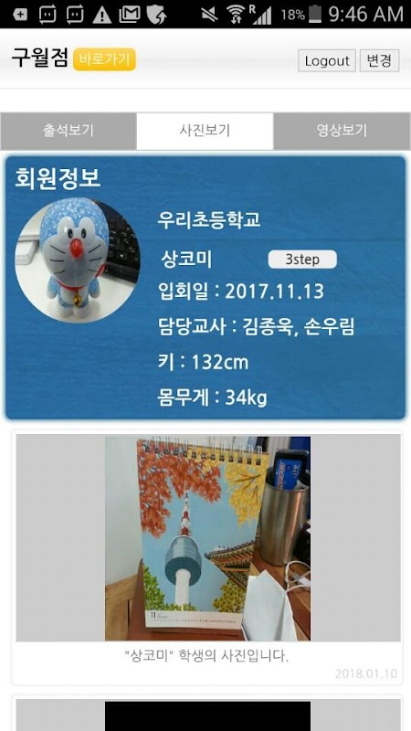 기능으로는 출석여부, 활동 사진 감상, 하루 영상 시청 등이 있습니다.
