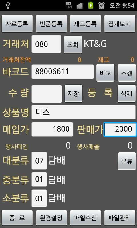 유통매장에서 사용하는 DT900과 같은 핸드터미널을 안드로이드폰에서 구현한 프로그램으로 안시포스를 사용 하고 있는 매장에서는 별도의 장비 구입 없이 스마트폰으로 매입,발주,재고조사,가격비교 등의 업무를 할수 있습니다.블루투스 무선 스캐너를 사용하면 보다 빠르게 업무를 처리 할 수 있습니다.