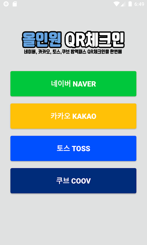 Naver, Kakao, Toss, COOV Dies ist eine App, die QR-Codes elektronischer Zugangslisten mit einem Tastendruck anzeigt.