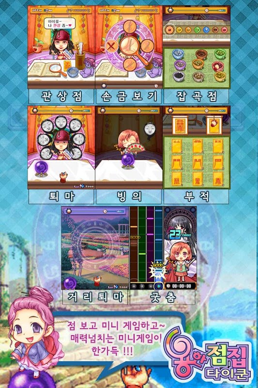 Mini-Spiele yonghan jeomjip Tycoon in koronaren getan, Handlesen, zeigen Getreide, Amulette, Besitz, Exorzismus, Entfernung Exorzismus usw. gutchum unterteilt.