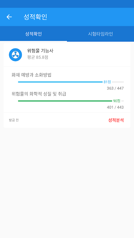 성적확인 - 각 과목별 성적 및 그동안 풀어본 기출문제와 모의고사, 문제풀기의 성적을 볼 수 있습니다.