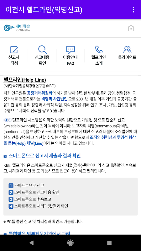 Das Korea Business Ethics Management Institute (KBEI), das die Icheon City Helpline (Anonymous Reporting) APP produziert und vertreibt, ist das erste auf ethisches Management spezialisierte Forschungsinstitut in Korea, das gegründet wurde, um ethisches Management von Unternehmen, Finanzen und öffentlichen Einrichtungen zu unterstützen.