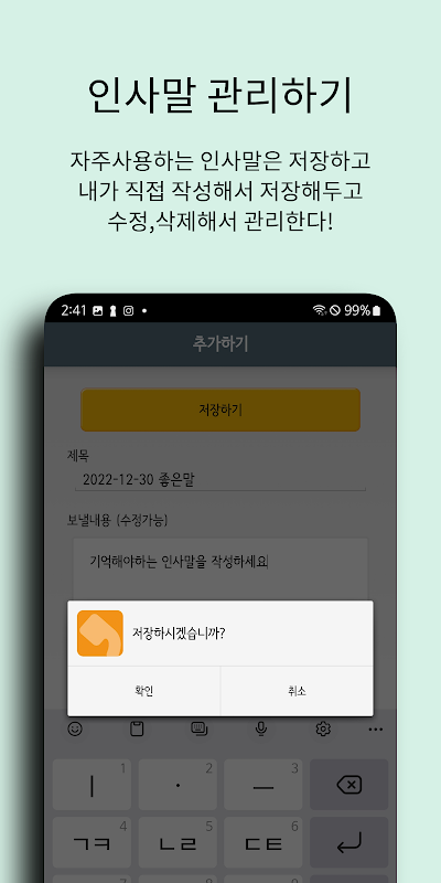 ※ 인사앱은 개인정보처리방침에 의거하여 기기 권한 설정인 '저장' 권한이 동의되어야 '인사말 즐겨찾기' 기능을 정상적으로 이용하실 수 있습니다.