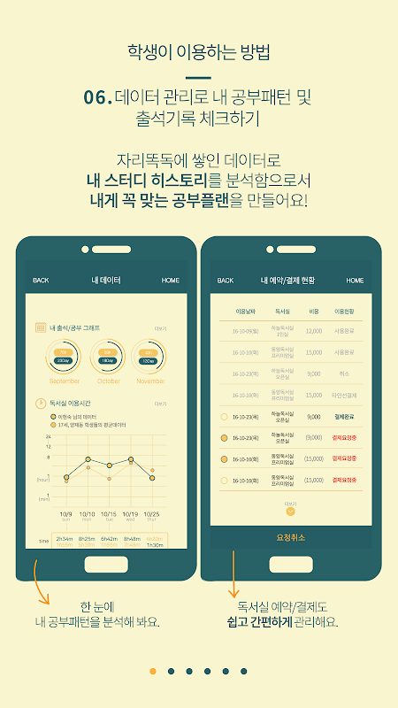 자리똑독을 통하여 1)독서실을 찾고 2)독서실을 비교하고 3)독서실을 예약하고 4)나의 공부데이터를 기록하여 스터디 패턴을 분석 할 수 있습니다.