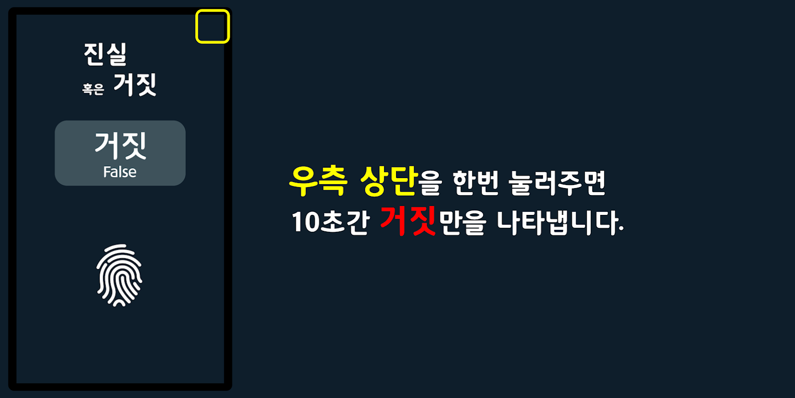우측상단의 모서리를 한번 누르면 10초동안 거짓만 나타납니다.
