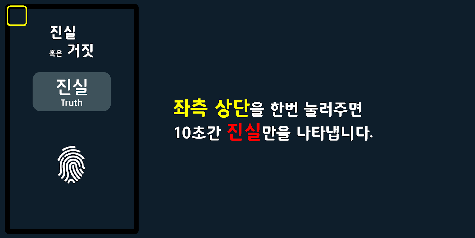 좌측상단의 모서리를 한번 누르면 10초동안 진실만 나타나고,