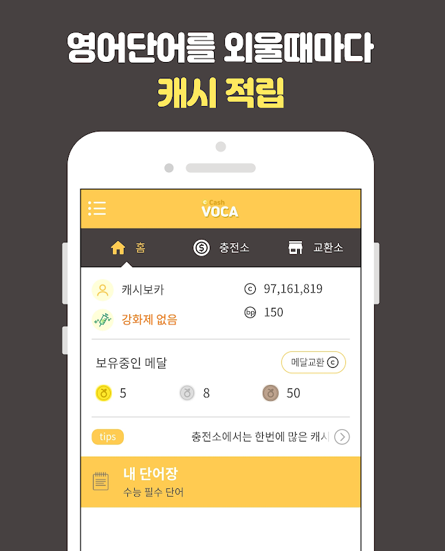 영어단어를 외우면 외울수록 캐시가 쌓이는 단어장나만의 영단어 암기 도우미이제 캐시보카로 영단어 외우고, 다양한 혜택도 누리자!