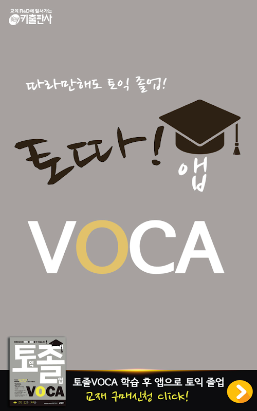 토따! VOCA APP 앱은 키출판사의 토익책 - 토졸(토익졸업) VOCA - 의 어휘훈련을 돕는 짝궁 앱으로 일명 ‘토따앱(토익! 나만 따라와)'입니다.