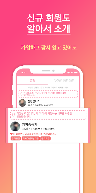 - 가입하고 잠시 잊어도 신규 회원을 알아서 소개해주는 소개팅입니다.