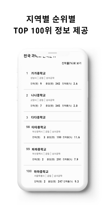Sie können die Zulassungs- und Karriererankings für Mittel- und Oberschulen landesweit und in 18 Regionen, darunter Seoul, Busan, Daegu und Incheon, überprüfen.