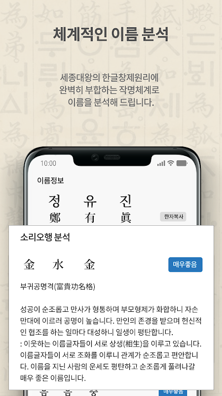 Wenn Sie den gewünschten koreanischen Namen in die App eingeben, empfiehlt diese automatisch chinesische Schriftzeichen und teilt Ihnen mit, ob dieser den Bedingungen der authentischen Namenswissenschaft entspricht. Sie müssen also nur die von der App vorgeschlagenen Verfahren befolgen.