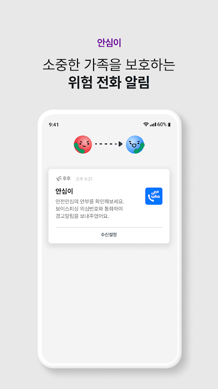Wenn ein Anruf mit einer gefährlichen Nummer verbunden ist, z. B. einem Voice-Phishing-Anruf, sendet der KI-Sheriff in Echtzeit eine Warnmeldung. Wenn Sie Ansim mit Ihrer Familie nutzen, wird Ihr Erziehungsberechtigter benachrichtigt, wenn ein Anruf mit einer gefährlichen Nummer verbunden ist.