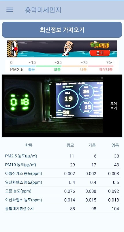 - 실제 용인 흥덕로의 실시간 개인 미세먼지 측정기 수치를 확인할 수 있습니다.