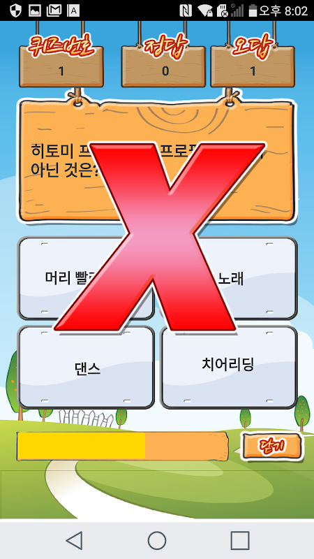 첫 화면에서 시작하기를 터치하고 다음화면에 나타난 "Go" 를 터치하면 퀴즈 풀기가 시작됩니다. 정답과 오답이 될때마다 "O"와 "X"가 나오는데 이를 터치해야 다음 문제로 넘어갑니다.