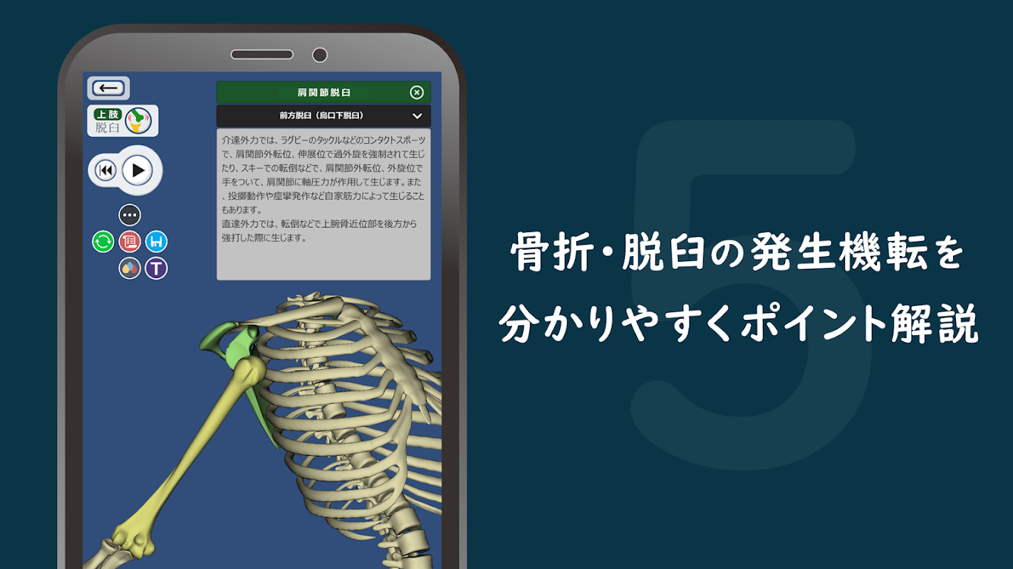 Eine App zum Erlernen von Frakturen und Luxationen, die Frakturen und Luxationen der oberen und unteren Extremitäten mit einem 3DCG-Modell und einer Animation reproduziert.