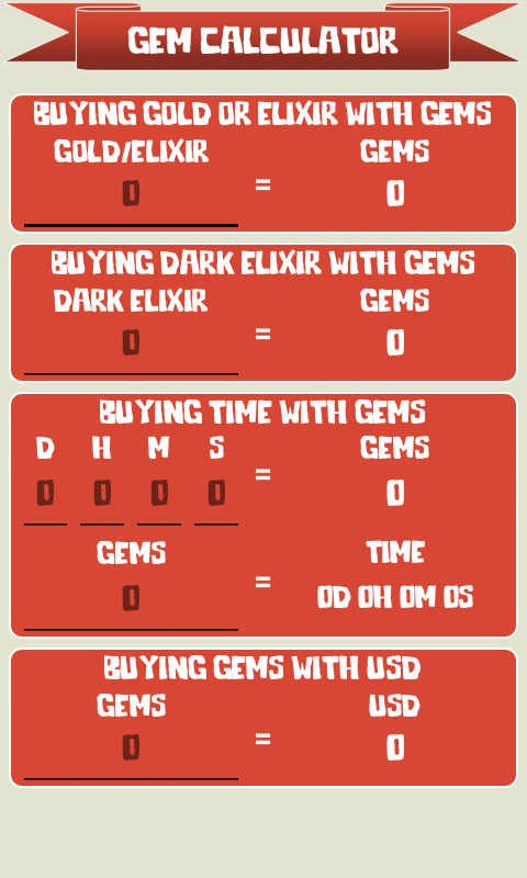 aufblicke leicht die Menge an Edelsteinen Ressourcen (Gold, Elixier, dunkler Elixier), einschließlich der Zeit, sowie einen Umsatz von Edelsteinen, um USD zu kaufen. Planen Sie im Voraus Ihre Clash of Clans Spiel mit diesem erstaunlichen App.