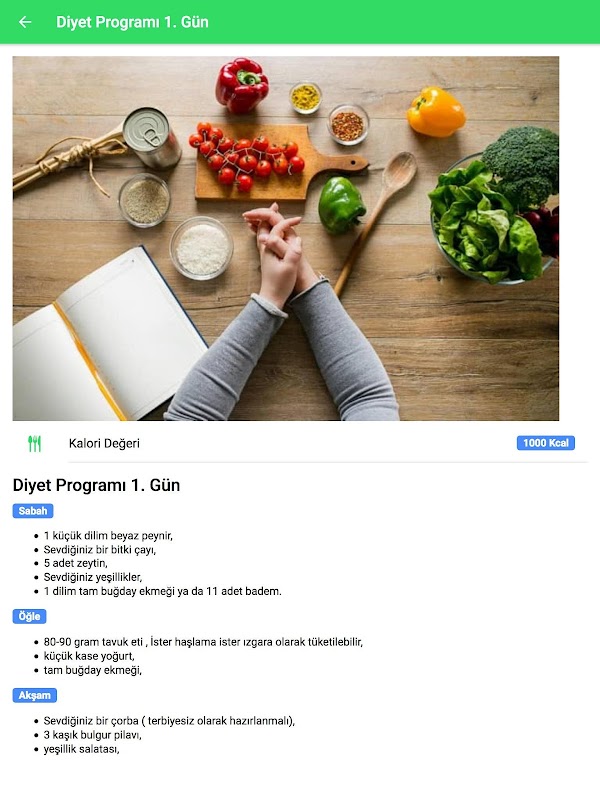 Wenn Sie eine einfache Berechnung durchführen, beträgt Ihre Grundumsatzrate 2000 Kalorien und Sie können mit dieser Diätliste von 1000 Kalorien 1 kg Fett pro Woche schmelzen. Wenn Ihr Gewicht zu groß ist, können Sie 1 kg Öl entsprechend 1 kg Körperwasser und 2 kg Wasser geben. Wenn wir Sport und Walking als Ergänzung hinzufügen, können 3-4 Kilo pro Woche verloren gehen, da das Kaloriendefizit zunimmt.