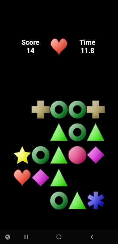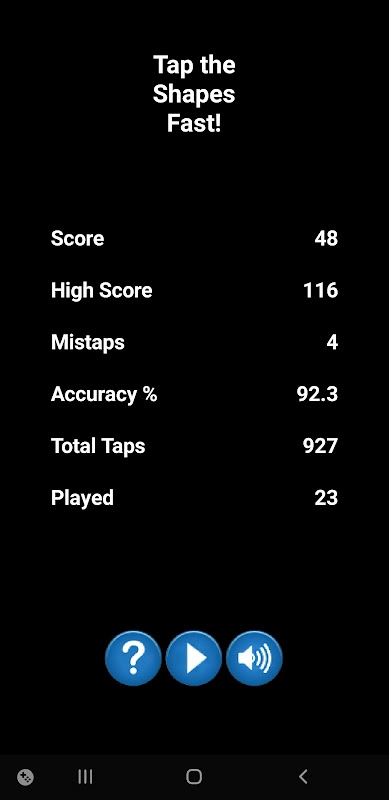 Sie haben 20 Sekunden Zeit, um so viele der richtigen Formen wie möglich anzutippen. Sie erhalten 0,1 Sekunden für jede richtige angetippte Form, die vergeben wird, wenn das Brett von der Zielform befreit wird. Zu den gemeldeten Statistiken gehören Punktzahl, Highscore, Gesamtzahl der Taps, gespielte Spiele, Anzahl der Fehler für dieses Spiel und Genauigkeit in Prozent für dieses Spiel.