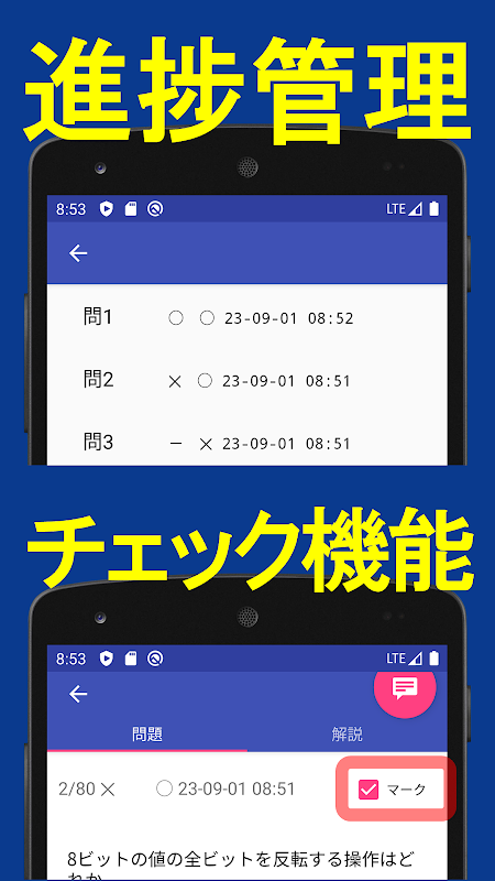 ● Zusätzlich zur Markierungsfunktion für Fragen haben wir eine Funktion entwickelt, mit der Sie Fragen mit zwei hintereinander richtigen Antworten (◎) ausschließen können, um das Verständnis zu gewährleisten. Arbeiten wir hart, bis wir alle ◎ haben!