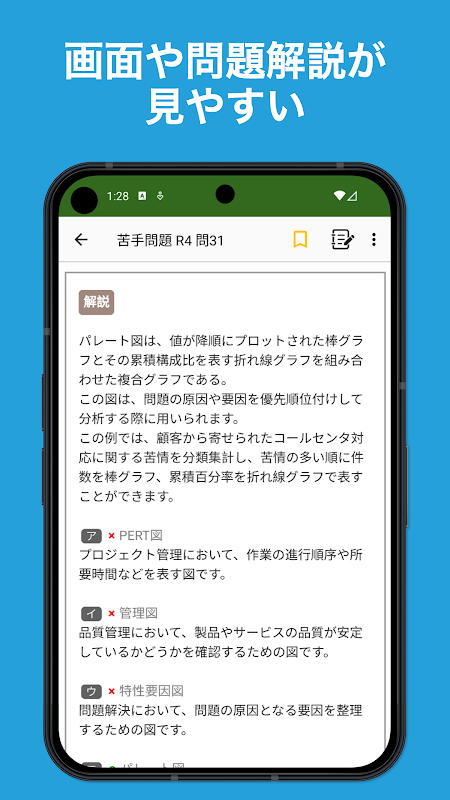 Einfache und benutzerfreundliche Benutzeroberfläche: Sie können Ihren Lernverlauf problemlos überprüfen und die Schriftgröße ändern. Besonderes Augenmerk haben wir auf die Bedienbarkeit gelegt. Sie können IT Passport auch in überfüllten Zügen oder in der Freizeit beim Muskeltraining bequem lernen.