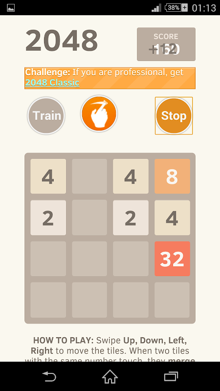 Swipe (Up, Down, Left, Right) to move the tiles. When two squares with the same number touch they merge into a one tile or a larger number (2 + 2 = 4, 4 + 4 = 8, and so on). When 2048 tile is created, the player wins!