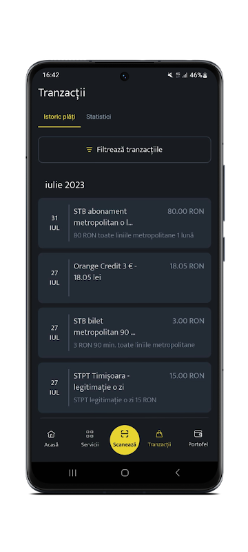 Die 24pay-App ist für den öffentlichen Verkehr über eine moderne, schnelle und sichere Zahlungslösung in 19 Hauptstädten Rumäniens verfügbar: Bukarest (STB), Timisoara (STPT), Cluj-Napoca (CTP Cluj), Iasi (CTP Iasi), Brasov (RATBV). SA), Arad (CTP Arad), Ramnicu Valcea (ETA SA), Targu Jiu (Transloc), Piatra Neamt (TPN), Sibiu (Tursib), Baia Mare (SC Urbis SA), Resita (Transport Urban Resita), Sacele ( Servicii Sacelene), Ploiesti (TCE), Roman (Solelga), Botosani (Eltrans), Constanta (CT Bus), Bacau, Sfantu Gheorghe (Sepsi Bus), Oradea (OTL).