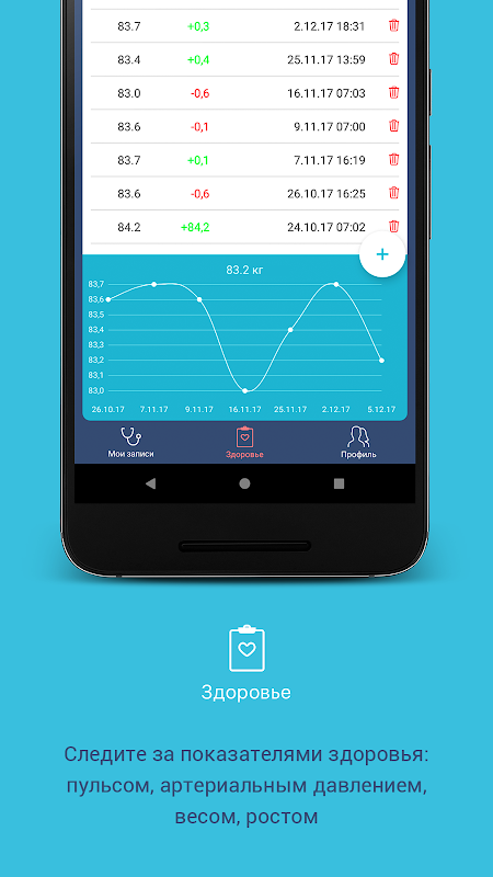 - Eingabe persönlicher Gesundheitsindikatoren (Größe, Gewicht, Puls, Temperatur, Druck, Blutzuckerspiegel, Cholesterinspiegel, Gesundheitseinschätzung nach der SCORE-Skala);