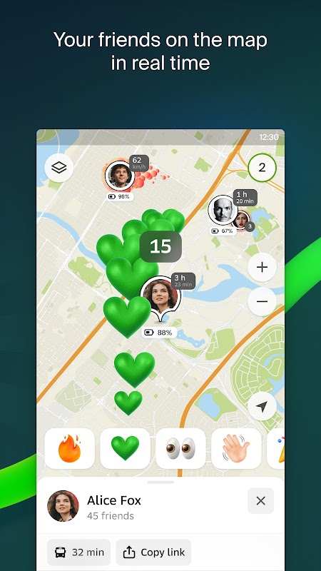 Bleiben Sie mit Freunden auf der Karte in Verbindung. Fügen Sie Ihre Freunde und Familienmitglieder als Freunde in 2GIS hinzu, um Live-Standorte zu teilen und sich gegenseitig in Echtzeit auf der Karte zu sehen! Fragen Sie nicht mehr „Wo bist du?“, sondern überprüfen Sie einfach den genauen Standort. Das vereinfacht die Terminplanung (insbesondere, wenn sich jemand verspätet) und ermöglicht spontane Treffen! Senden Sie einem Freund ein Emoji, um ein Treffen anzubieten, oder beginnen Sie ein Gespräch im Chat, ohne zu einem Messenger wechseln zu müssen.