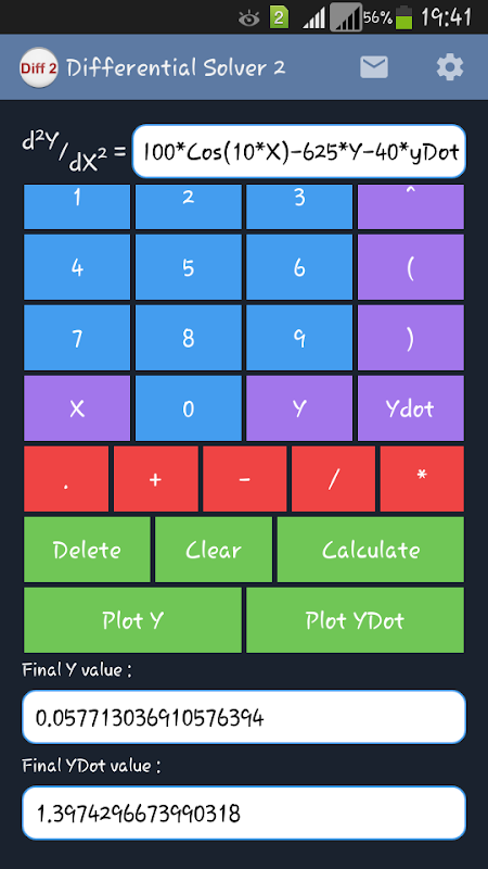 • Based on capability and limitations of Android system the maximum difference in initial and final X for “Calculate”, “Plot” and “Plot yDot” as fixed as “50”, “30” and “30” respectively. For Y and dY/dX at a range greater than 50, use the step process described above. (For larger ranger of 200 and 100 for calculation and plotting, Please try Paid App)
