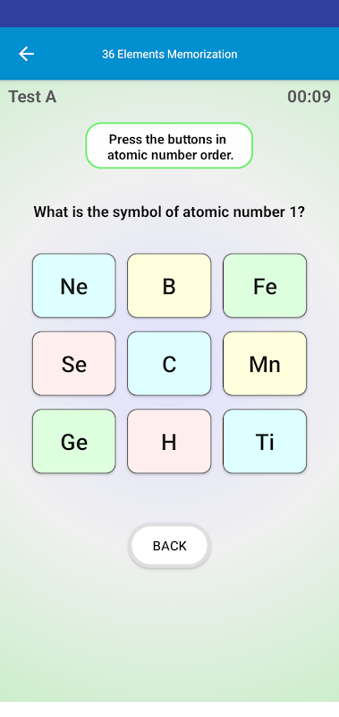 Diese Anwendung unterstützt das Auswendiglernen chemischer Elementsymbole von Ordnungszahl 1 Wasserstoff (H) bis Ordnungszahl 36 Krypton (Kr).