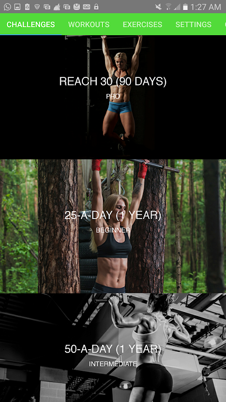 Es gibt mehrere Herausforderungen für Sie zur Auswahl, um Sie Ihre Fitness-Ziele zu erreichen. Die Herausforderungen haben verschiedene Längen und Ziele. Sie sagen, den App, was Ihr aktuelles Fitness-Level ist und sie paßt die Herausforderung speziell für Sie!