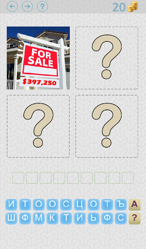 Изначально открыта только одна фотография. Чем меньше картинок вы откроете, тем больше монет получите за отгаданное слово!