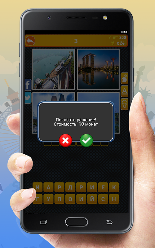 Die Regeln sind sehr einfach: Für 4 Bilder (Bilder) müssen Sie das einheitliche Wort Stadt oder Land erraten. Schauen Sie sich die Bilder an - zeichnen Sie eine Analogie und raten Sie das Wort. Wenn Sie in irgendeiner Form nicht weiterkommen, verwenden Sie die Eingabeaufforderungen "Nicht benötigte Buchstaben löschen", "Den richtigen Buchstaben einfügen" oder "Wort anzeigen".