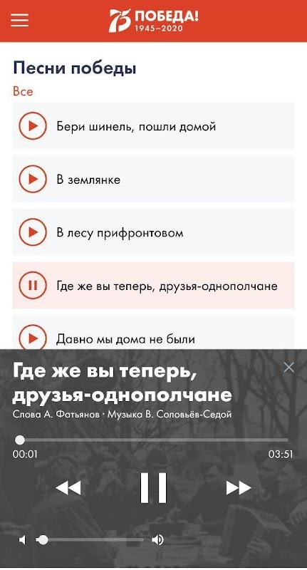 Abschnitte der offiziellen mobilen Anwendung zur Feier des 75. Jahrestages des Sieges werden ständig aktualisiert. Bleib dran!