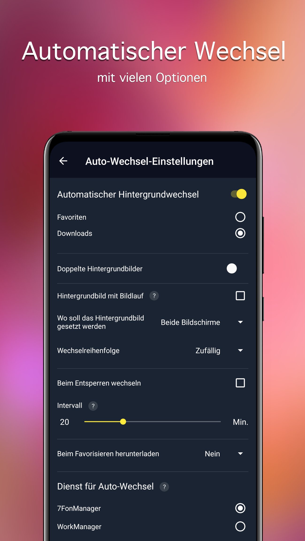 Fügen Sie Lieblingsbilder zu den Favoriten hinzu, wählen Sie Quelle und Intervall — dann wechselt der Hintergrund automatisch. Stellen Sie den Zeitplan ein, und Ihre Hintergründe werden ohne zusätzliche Schritte aktualisiert.