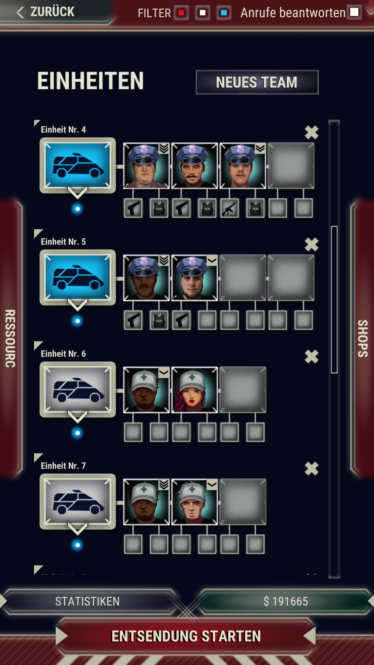 Du hast eine Reihe an Polizei-, Feuerwehr- und Sanitätseinheiten zur Verfügung. Alle Einheiten verfügen über unterschiedliche Fahrzeuge (angefangen bei einfachen Krankenwagen bis hin zu Hubschraubern), hilfreiches Equipment (u. a. kugelsichere Westen, Erste-Hilfe-Kits oder technisches Zubehör) sowie professionelle Teammitglieder mit unterschiedlichen Fähigkeiten.