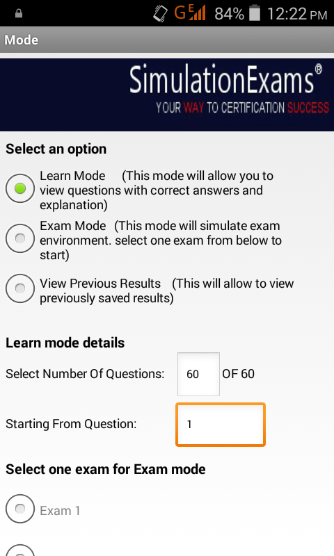 Complete explanation is provided for each question in Learn mode, and actual exam environment is simulated in Exam mode. Options to save the results and reviewing questions are provided.