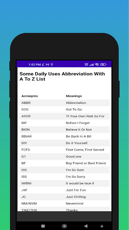 Abkürzungen mit einer Liste von A bis Z. Sie können in dieser App nach jeder Abkürzung suchen