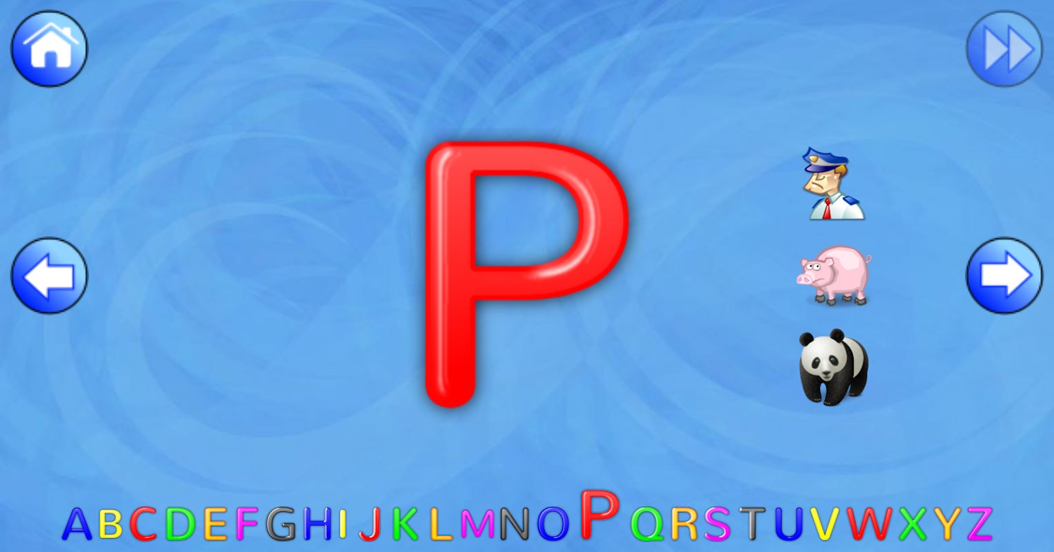 Jeder Buchstabe hat auch lustige Bilder, die sich auf Wörter beziehen, die mit diesem Buchstaben beginnen. Sie können auch auf diese Bilder tippen, um zu hören, wie diese Wörter ausgesprochen werden.