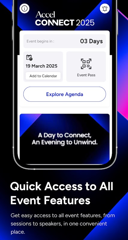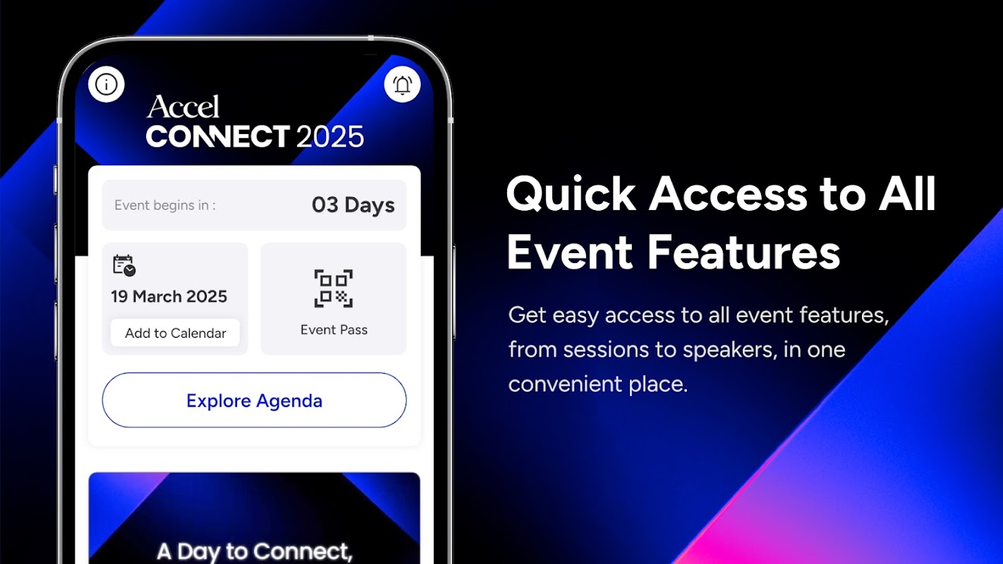 With the Accel Connect app, streamline your experience—check in seamlessly with your event pass, access the full schedule, connect with attendees, schedule 1-on-1 meetings, exchange contacts instantly with the built-in scanner, and relive moments with event photos.