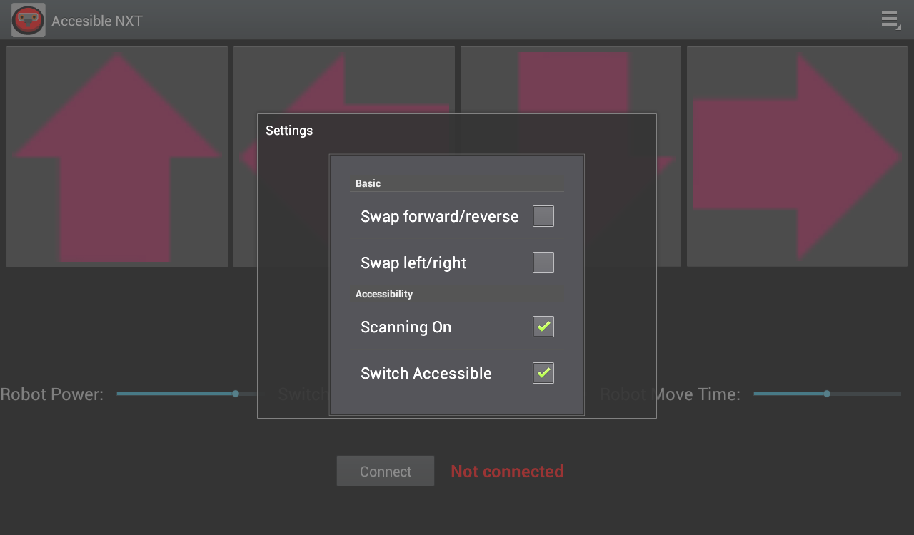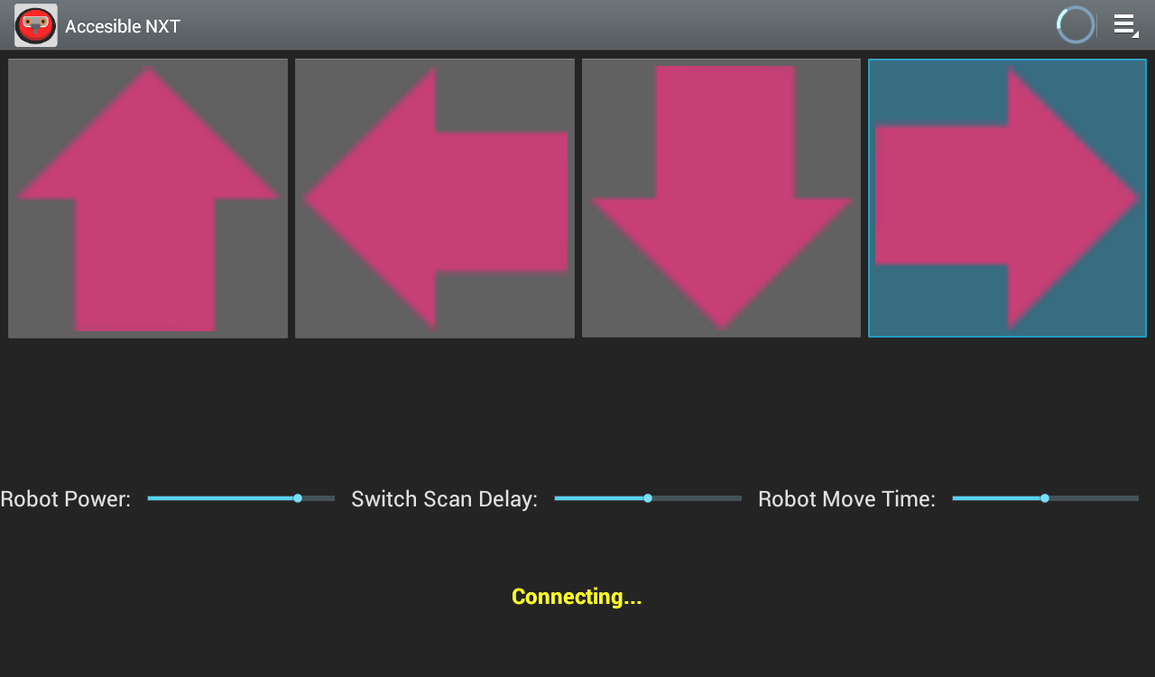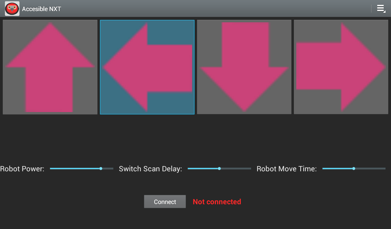Accessible NXT is a switch-accessible app that lets you control your Lego Mindstorms NXT robot. Children can use touch to interact with the robot GUI or use an external switch connected through a Bluetooth switch interface such as TabAccess. The app is designed to engage children with motor disabilities in robot educational activities.