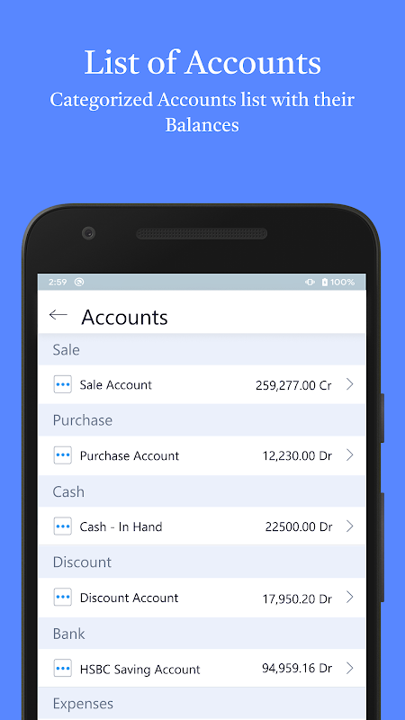 Einfache Buchhaltung hilft Ihnen dabei, alle Ihre Transaktionen wie Verkauf, Kauf, Zahlungen, Ausgaben, Steuern usw. auf äußerst einfache Weise aufzuzeichnen.