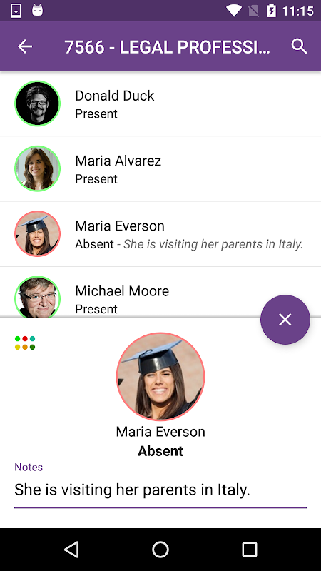 • Rufen Sie die Rolle mit Ihrem Android-Gerät an. Markieren Sie einfach den entsprechenden Anwesenheitsstatus für jeden Schüler: anwesend, abwesend, verspätet usw.